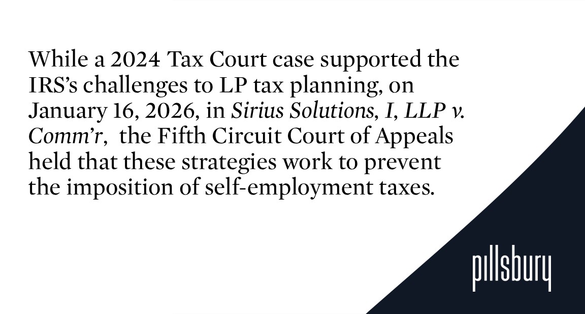 Many private fund managers restructured their LP ownership arrangements following the Tax Court decisions in Soroban and Denham and the stipulation originally entered into in Sirius. And while the Fifth Circuit’s decision won’t bind the IRS when appeals lie to other circuit courts, it should allow taxpayers who have capitulated to the IRS position to file refund claims and/or restructure to once again allow them to claim the social security tax exemptions for LPs.